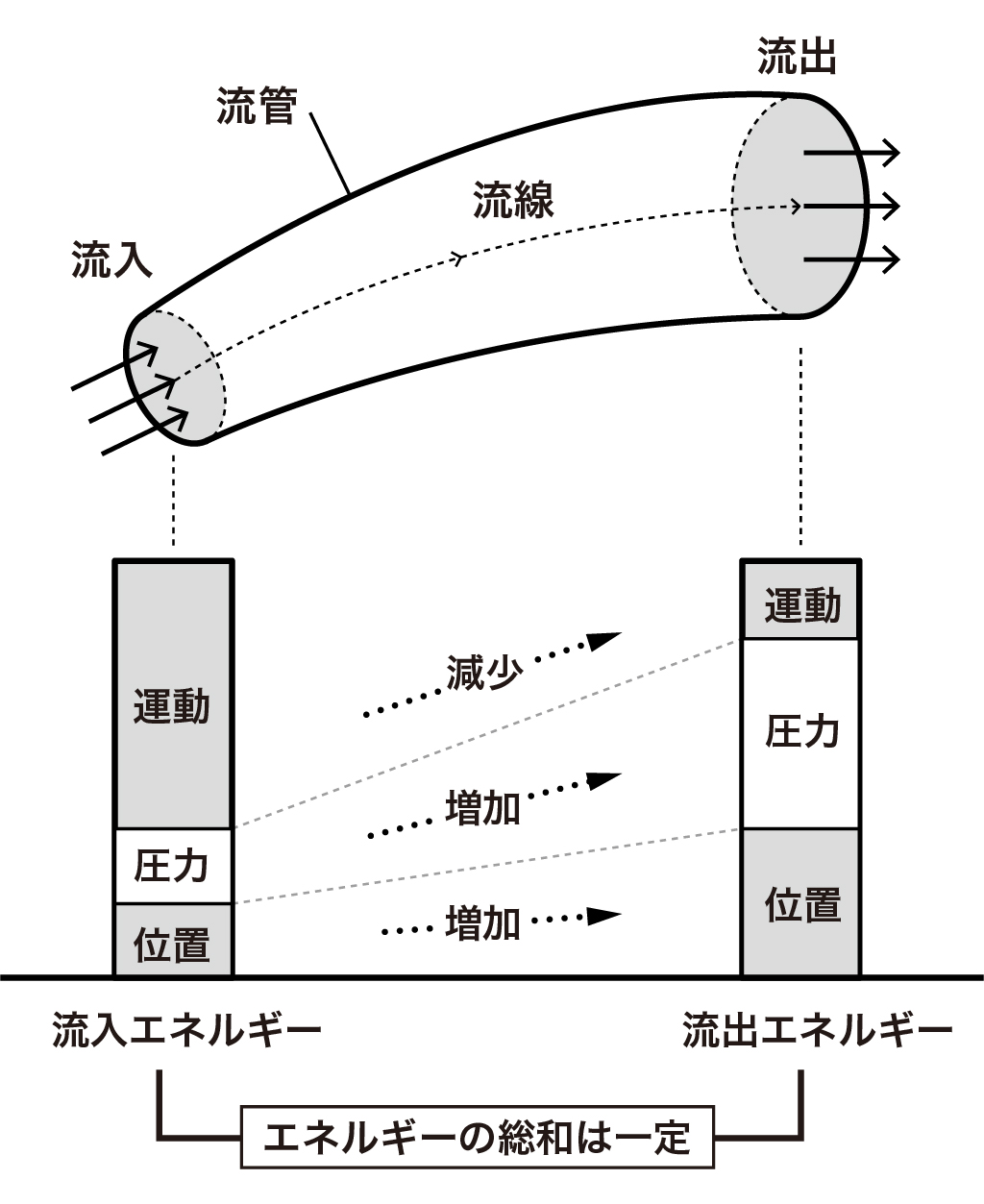 製造プロセスでは、配管の途中で径が変化したり、高低差が生じたりすることが一般的です。このような場合でも、摩擦などのエネルギー損失がなければ、圧力・速度・高さのエネルギー形態が相互に変換されながら総量は保たれます。
