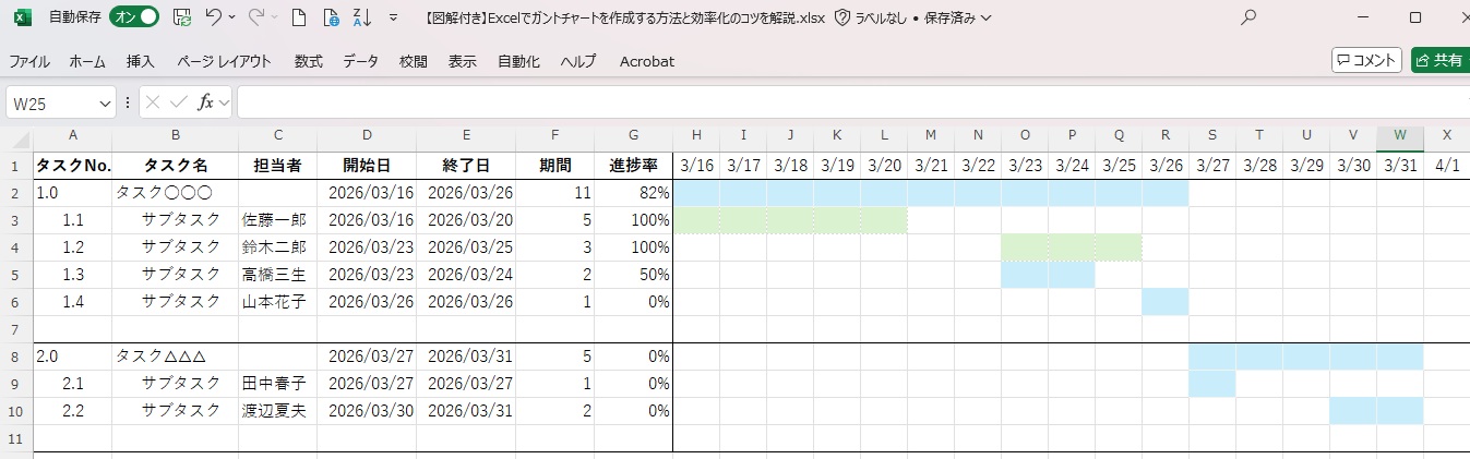 - タスク名:各作業項目を明確に記載し、WBS番号などで階層構造を表現