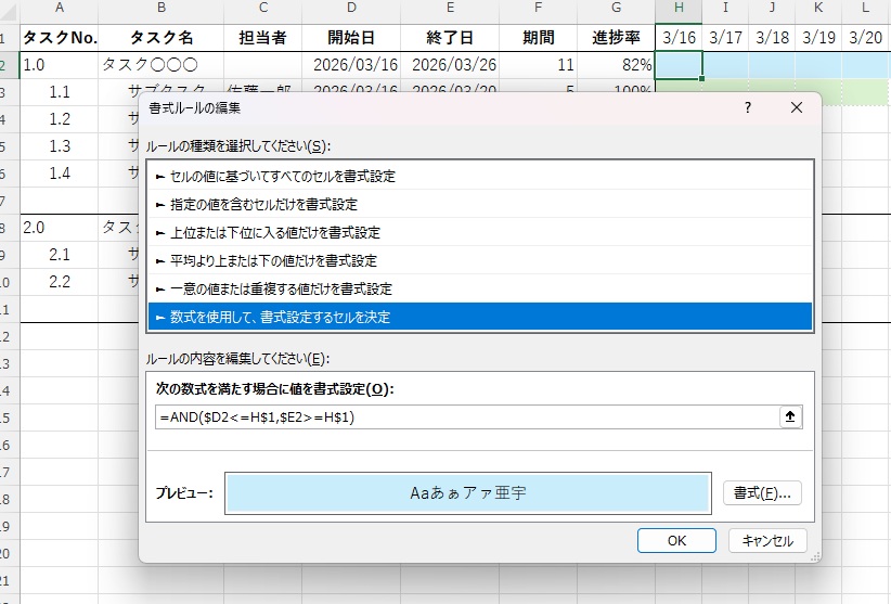 「ホーム」タブから「条件付き書式」→「新しいルール」→「数式を使用して、書式設定するセルを決定」を選択します。数式欄に「=AND($D3<=H$1,$E3>=H$1)」と入力し、書式設定で塗りつぶし色を指定します。この数式により、各セルの列ヘッダー日付がそのタスクの開始日から終了日の範囲内にある場合にのみ、色が適用されます。