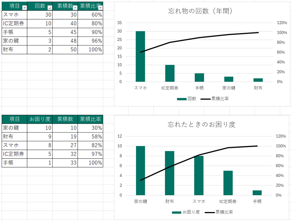 図1では、忘れ物の頻度と、忘れたら困る度数を10段階評価して数字にしたデータを、パレート図にまとめています。