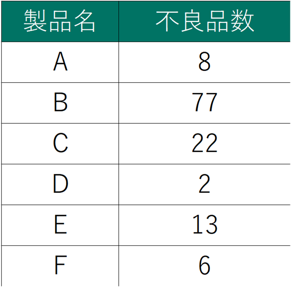 日々の業務のグラフ化作成では、通常、帳票ソフトを使用することが一般的ですが、本記事ではExcelを使って解説します。 まず、製品ごとの不良品数をまとめます(図2)。