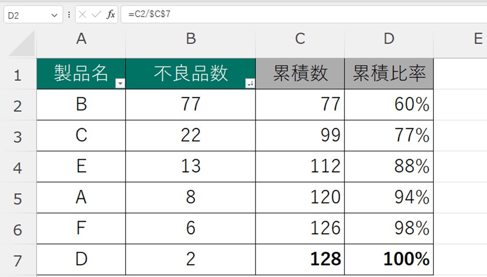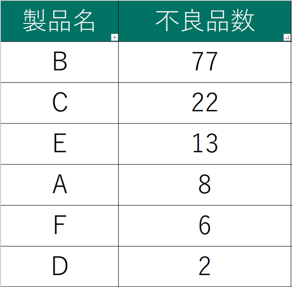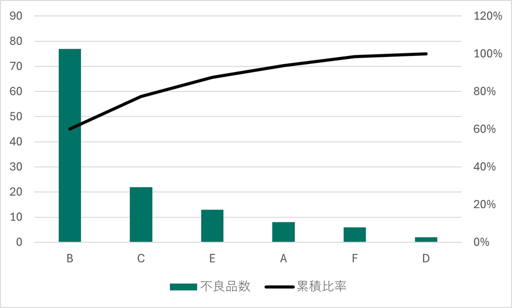 今回のパレート図からは、製品BとCだけで既に累積比率が約80%もあります。従って、この2製品の品質改善を優先的に取り組むべきかもしれないことが分かります。
