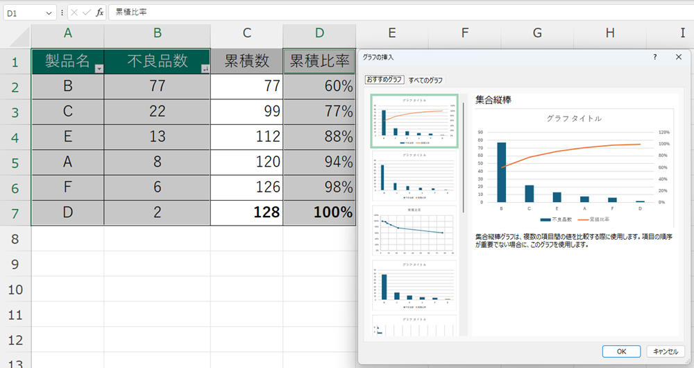 累積数とは、上から順にデータを足していった数字です。さらに各項目のデータ数を累積数の合計で割った数値を累積比率といいます。累積数の最後のセルは不良品の合計数になり、累積比率も100%になります。 次に、上の表を使ってパレート図を作ります(図5)。C列を除外して選択し、「おすすめグラフ」を選択し、「集合縦棒」というグラフを選びます(表の内容からExcel側が自動判定してくれることが多いです)。