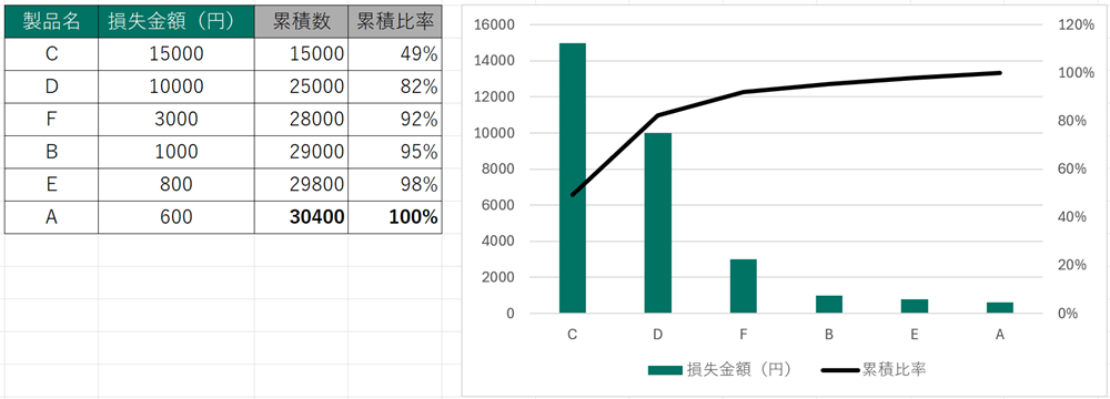 損失金額ベースで見ると、製品CとDだけで8割を占めていることが分かります。図6の不良数ベースのパレート図も考慮すると、製品Cの対応は優先度が非常に高いといえます。